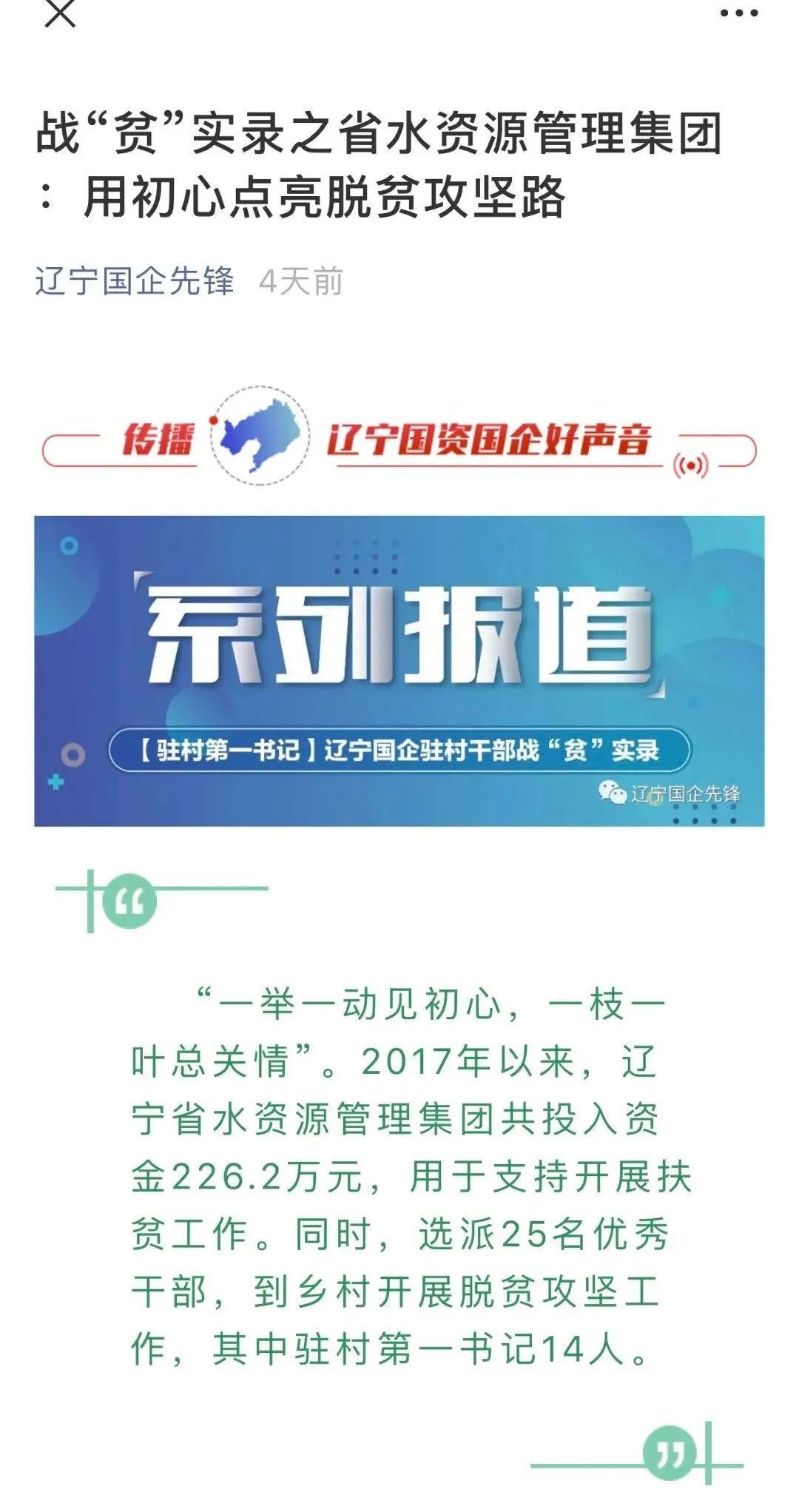 省水资源集团选派25名优秀干部开展脱贫攻坚工作,其中驻村第一书记14人,一个个帮扶项目落地实施,一户户贫困家庭脱贫摘帽,集团为脱贫攻坚工作做出重要贡献。集团脱贫攻坚工作受到省国资委的关注和肯定,省国资委官方微信公众号“辽宁国企先锋”首次以整期推送的形式报道集团战“贫”实录。