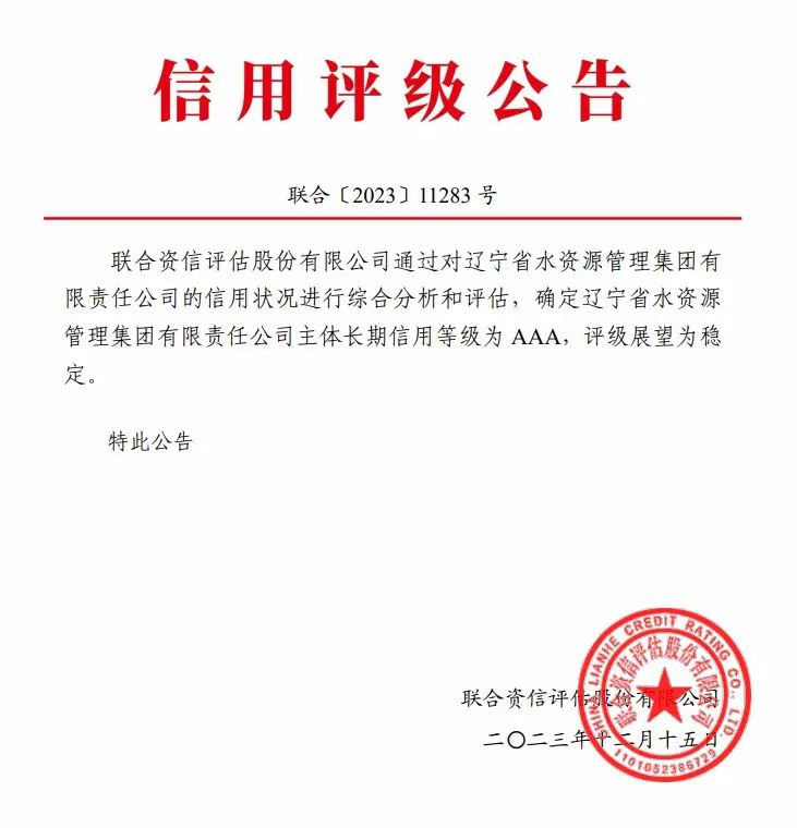 12月15日,联合资信评估股份有限公司通过对辽水集团信用状况进行综合分析和评估,确定集团主体长期信用等级为AAA,评级展望为稳定。《评级报告》显示,辽水集团经营环境良好、供水行业地位显著、债务负担较轻,融资渠道畅通、法人治理结构合理有效、运行良好、管理制度健全、营业总收入持续增长、未来增长空间较大、公司设计资质齐全且等级高,业务持续性良好。特别是2020年以来,公司资产规模持续增长,固定资产、在建工程和无形资产占比较高,符合水务行业特点,公司整体资产质量较好。