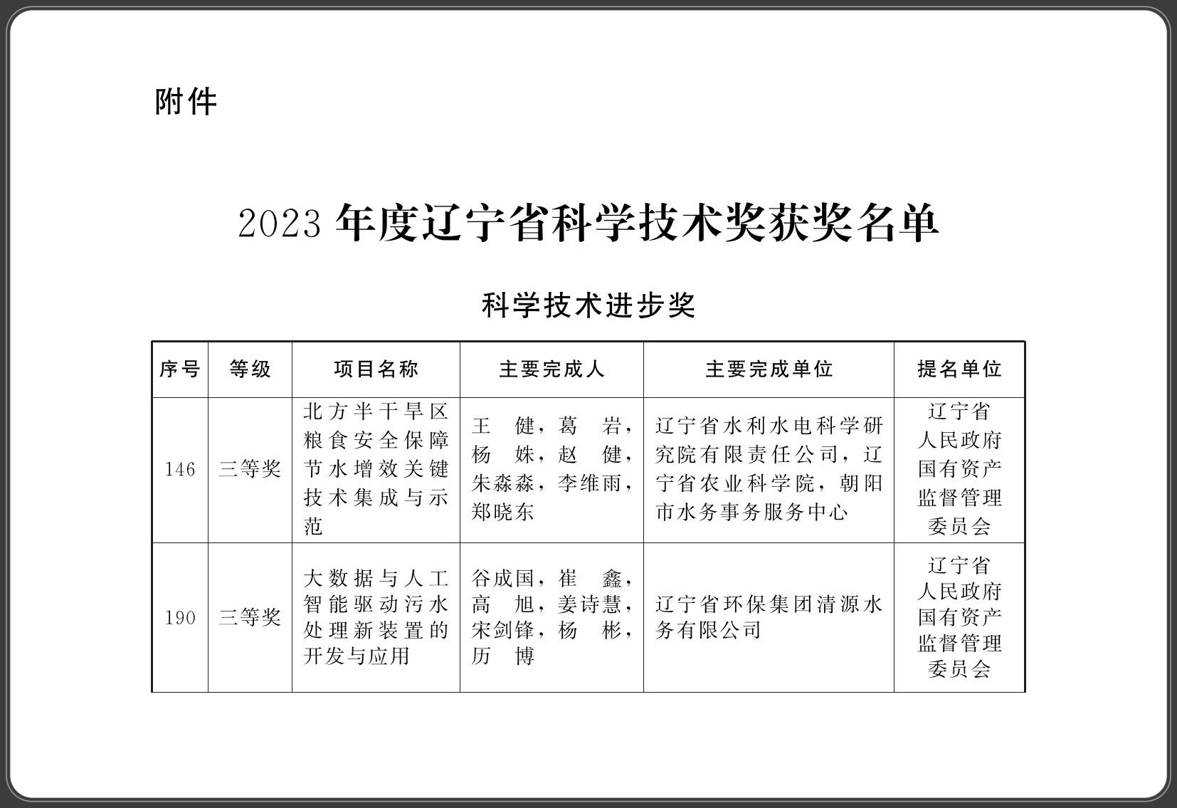 日前,省政府发布《辽宁省人民政府关于2023年度辽宁省科学技术奖励的决定》,对为辽宁省科学技术进步和经济社会发展作出突出贡献的科学技术人员和组织给予奖励。集团两个项目荣获科学技术进步奖三等奖,分别是水科院公司的北方半干旱区粮食安全保障节水增效关键技术集成与示范项目、环保集团公司清源水务公司的大数据与人工智能驱动污水处理新装置的开发与应用项目。