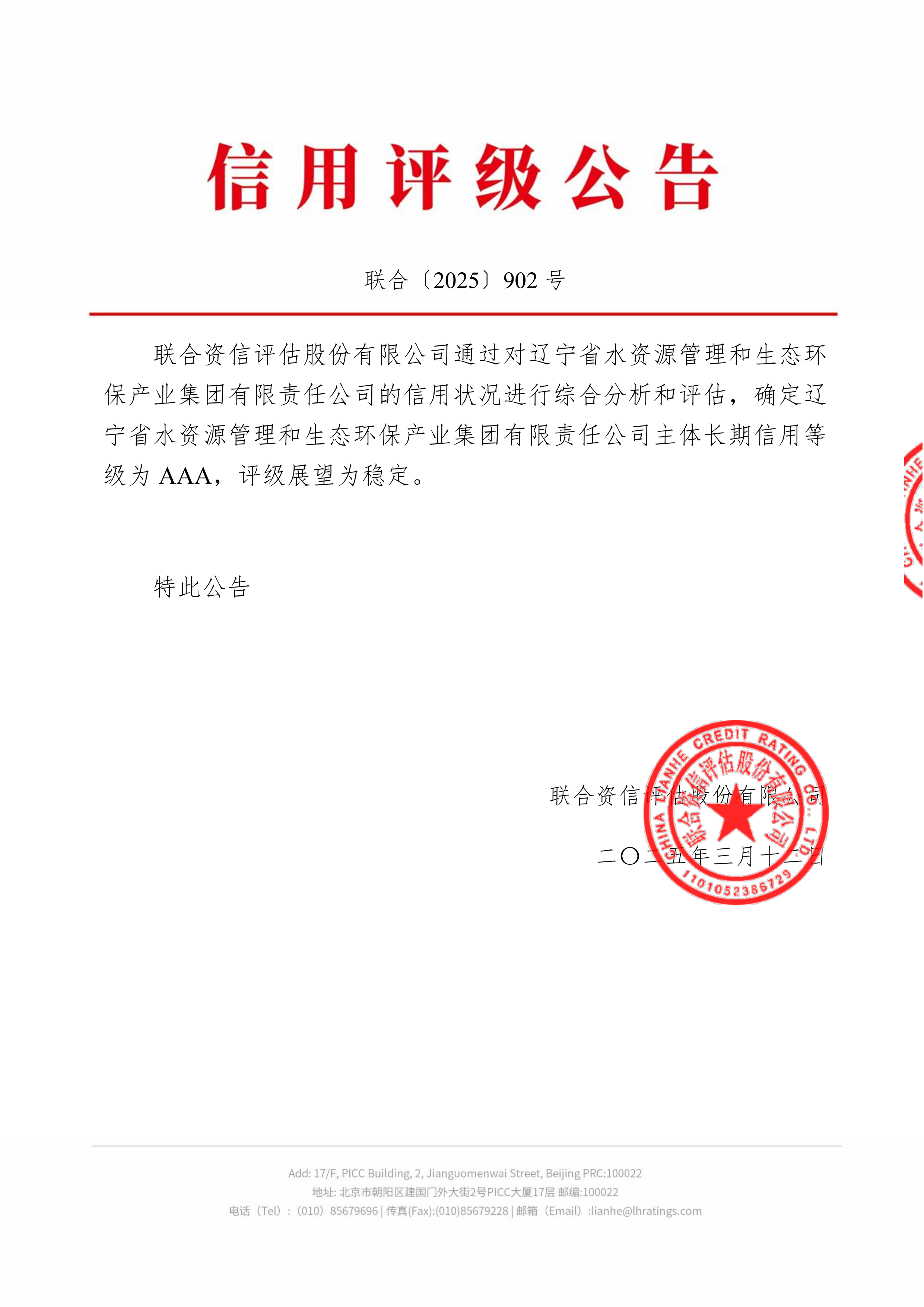 3月12日,经国内权威信用评级机构联合资信评估股份有限公司评定,集团凭借卓越的经营业绩、完善的法人治理结构、稳健的财务指标及强劲的可持续发展能力,再次荣获AAA主体信用等级、评级展望为“稳定”。