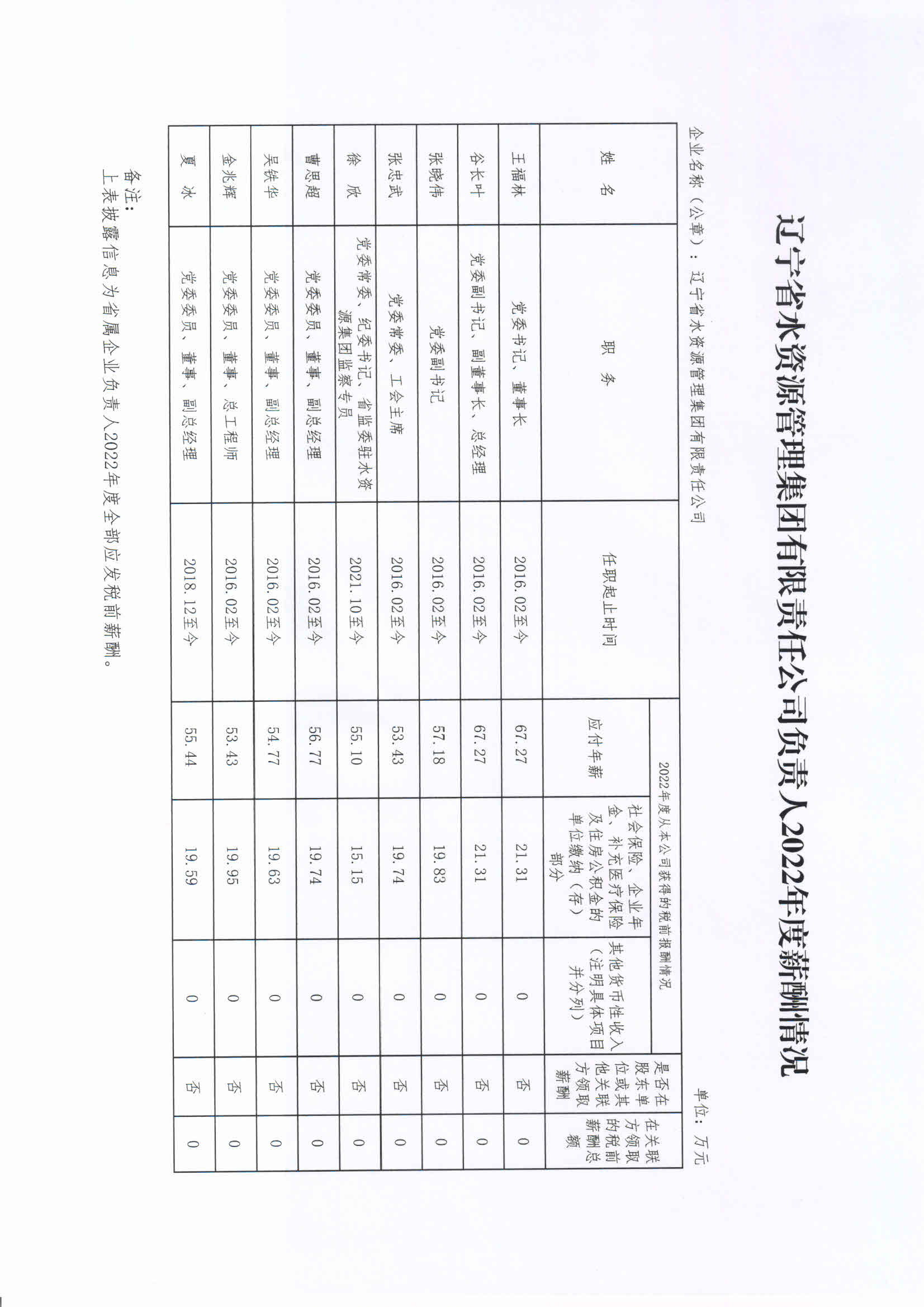 辽宁省水资源管理集团有限责任公司2022年度企业负责人薪酬情况