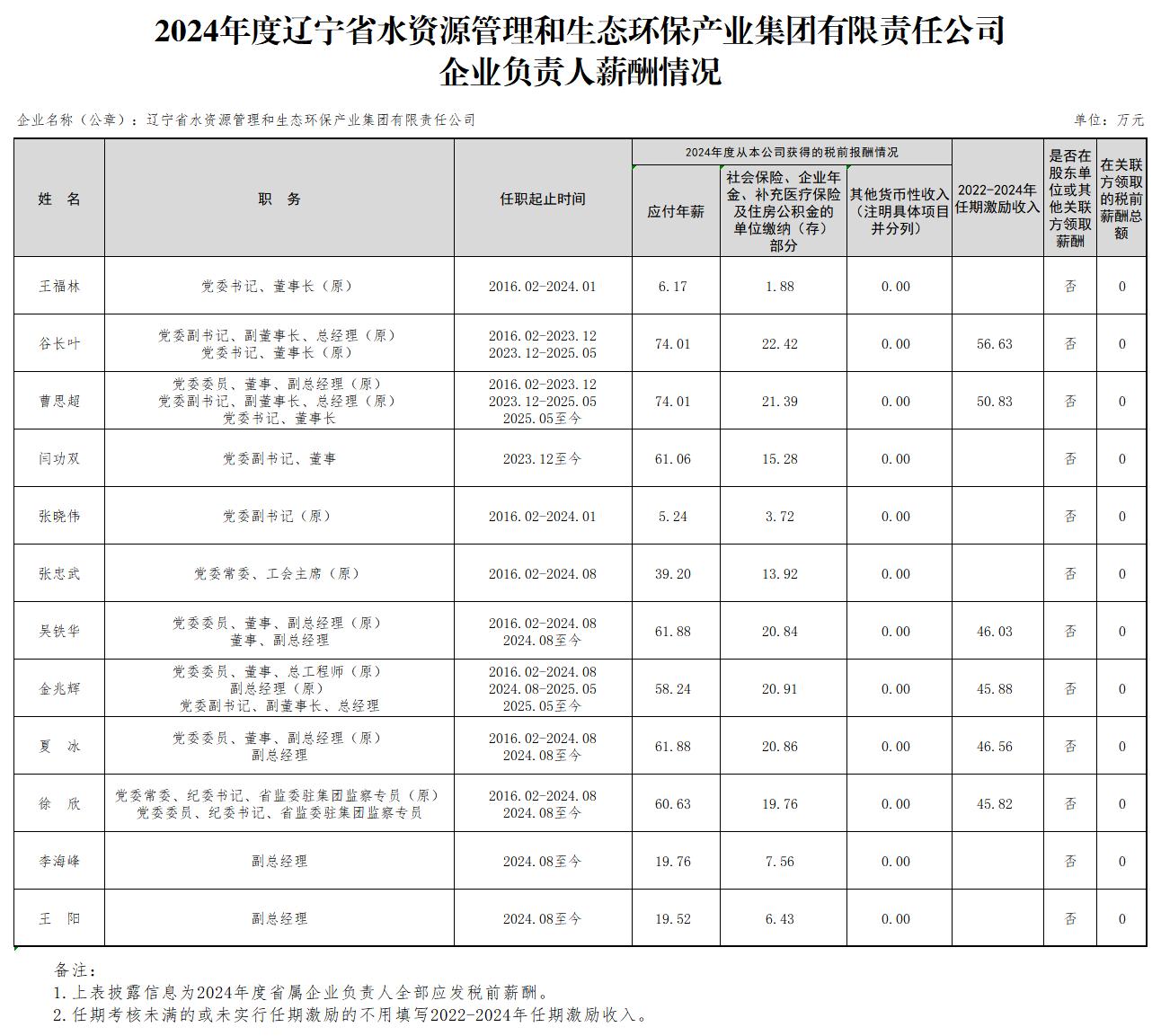 2024年度辽宁省水资源管理和生态环保产业集团有限责任公司企业负责人薪酬情况